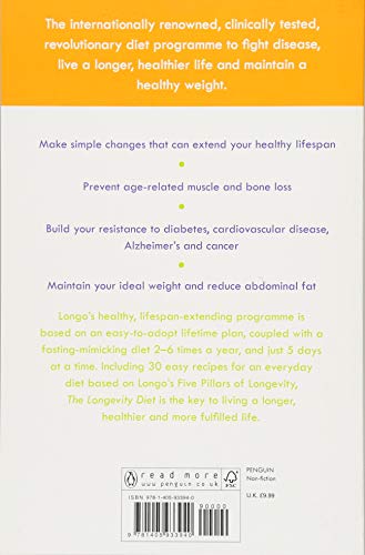 The internationally renowned, clinically tested, revolutionary diet program to lose weight, fight disease, and live a longer, healthier life. Can what you eat determine how long, and how well, you live? The clinically proven answer is yes, and The Longevity Diet is easier to follow than you’d think. The culmination of 25 years of research on ageing, nutrition, and disease across the globe, this unique combination of an everyday diet and fasting-mimicking diet (FMD) to be done only 3-4 times per year lays out a simple solution to living to a healthy old age through nutrition. FMD does away with the misery and starvation most of us experience while fasting and helps you reap all the beneficial health effects of a restrictive diet while avoiding the negative stressors, like low energy and sleeplessness. Valter Longo, Director of the Longevity Institute at USC and the Program on Longevity and Cancer at IFOM in Milan, developed THE FMD after making a series of remarkable discoveries in mice and humans indicating that specific diets can activate stem cells and promote regeneration and rejuvenation in multiple organs to reduce the risk for diabetes, cancer, Alzheimer’s and heart disease. Longo’s simple pescatarian daily eating plan and the periodic, fasting-mimicking techniques can both yield impressive results. Low in proteins and sugars and rich in healthy fats and plant-based foods, The Longevity Diet is clinically proven to help you: Lose weight and reduce abdominal fat Make simple changes which can extend the healthy lifespan Prevent age-related muscle and bone loss Build your resistance to diabetes, cardiovascular disease, Alzheimer’s and cancerLongo’s healthy, life span-extending plan is based on an easy-to-adopt pescatarian plan along with the fasting-mimicking diet 4 times a year, and just 5 days at a time. Including 30 easy recipes for an everyday diet based on Longo’s five pillars of longevity, The Longevity Diet is the key to living a longer, healthier, and mor