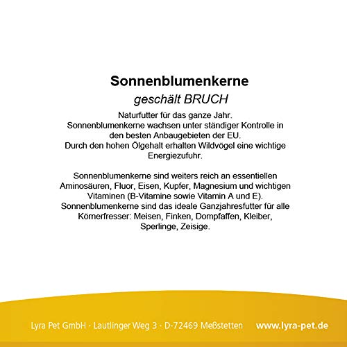 Lyra Pet Sonnenblumenkerne geschält BRUCH Alleinfuttermittel für Wildvögel Naturfutter für das ganze Jahr. Sonnenblumenkerne wachsen unter ständiger Kontrolle in den besten Anbaugebieten der EU. Durch den hohen Ölgehalt erhalten Wildvögel eine wichtige Energiezufuhr. Sonnenblumenkerne sind weiters reich an essentiellen Aminosäuren, Fluor, Eisen, Kupfer, Magnesium und wichtigen Vitaminen (B-Vitamine sowie Vitamin A und E). Sonnenblumenkerne sind das ideale Ganzjahresfutter für alle Körnerfresser: Meisen, Finken, Dompfaffen, Kleiber, Sperlinge, Zeisige. Deklaration: 100% Sonnenblumenkerne geschält BRUCH Reinheit: 99,95 % kühl und trocken lagern!!
