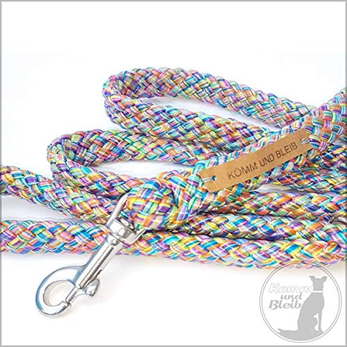 Führleine Classic von KOMM UND BLEIB mit Karabiner und Handschlaufe – bewährt, praktisch und einfach gut! Wir arbeiten standardmäßig einen kleinen Ring an der Basis der Handschlaufe ein, sodass du dir die Leine bequem umhängen kannst, wenn dein Hund im Freilauf ist. (Manche befestigen hier auch ein Täschchen für Kotbeutel, einen Glücksbringer oder haken eine Hundepfeife ein.) … … … Die Classic-Leinen werden aus ca. 17 mm breitem PP-Seil (Ø 12mm) gefertigt, das leicht und griffig ist. Die Länge inkl. Handschalufe beträgt 1,90m. Der Karabiner aus reinem Edelstahl rostet nicht, ist stabil und für mittelgroße Hunde bis ca. 45 kg geeignet. Für beste Kontrolle über sehr große Hunde raten wir zu einem Kurzführer. >> Schau bei unseren anderen gelistetetn Produkten nach. … … … Du benötigst eine andere Länge? Sprich uns an, wir helfen dir gern weiter! … … … Bitte beachte: Da jede Leine handgemacht ist, kann es zu Abweichungen in der Länge von bis zu +/- 3 cm kommen. Grundsätzlich werden die Leinen mit der Zeit (und dem Gebrauch) weicher, griffiger und flexibler.