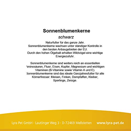 Lyra Pet Sonnenblumenkerne schwarz Alleinfuttermittel für Wildvögel Naturfutter für das ganze Jahr. Sonnenblumenkerne wachsen unter ständiger Kontrolle in den besten Anbaugebieten der EU. Durch den hohen Ölgehalt erhalten Wildvögel eine wichtige Energiezufuhr. Sonnenblumenkerne sind weiters reich an essentiellen Aminosäuren, Fluor, Eisen, Kupfer, Magnesium und wichtigen Vitaminen (B-Vitamine sowie Vitamin A und E). Sonnenblumenkerne sind das ideale Ganzjahresfutter für alle Körnerfresser: Meisen, Finken, Dompfaffen, Kleiber, Sperlinge, Zeisige. Deklaration: 100% Sonnenblumenkerne schwarz Reinheit: 98% Sonnenblumenkerne; 2% Ast-und Blattreste kühl und trocken lagern!!